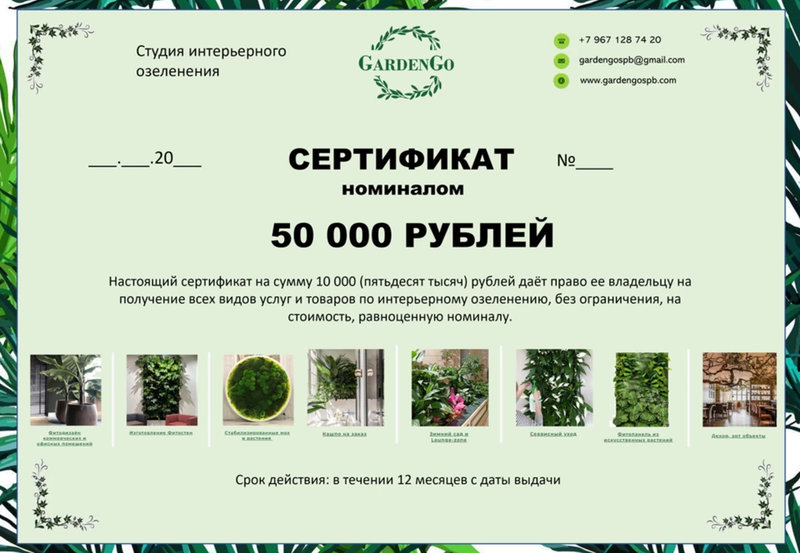 Обладатель сертификата сможет использовать его на все виды услуг и товаров, предлагаемых компанией: от покупки комнатных растений и кашпо до заказа комплексного озеленения интерьеров, создания фитостен или оформления мероприятий.