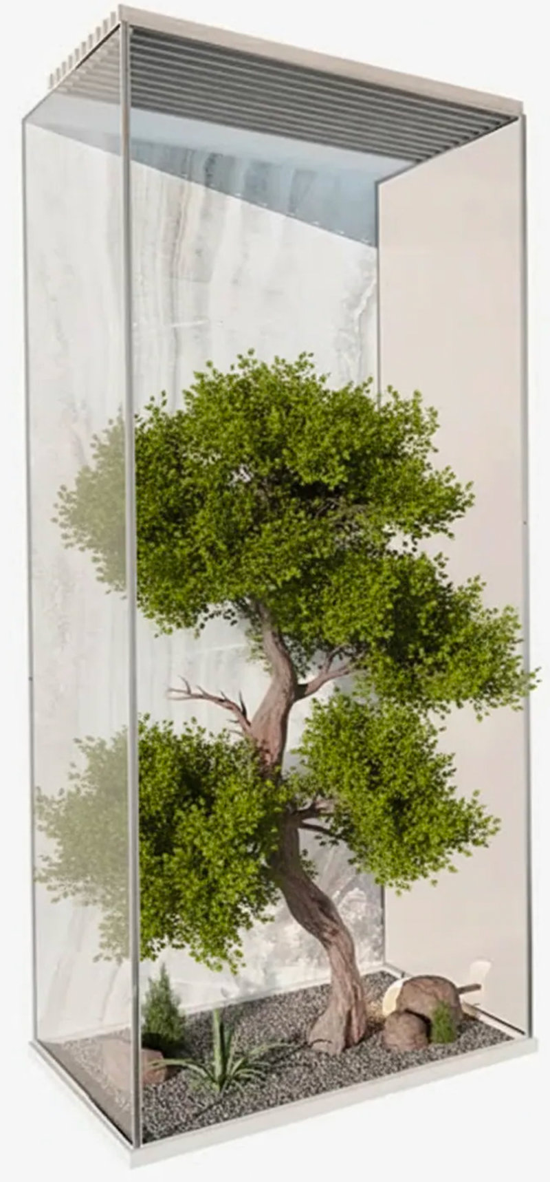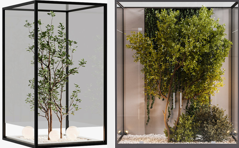 За стеклом расположены искусственные растения, которые выглядят очень реалистично и не требуют никакого ухода, что делает этот интерьерный аксессуар идеальным выбором для занятых людей или тех, кто не имеет возможности заниматься живыми цветами.