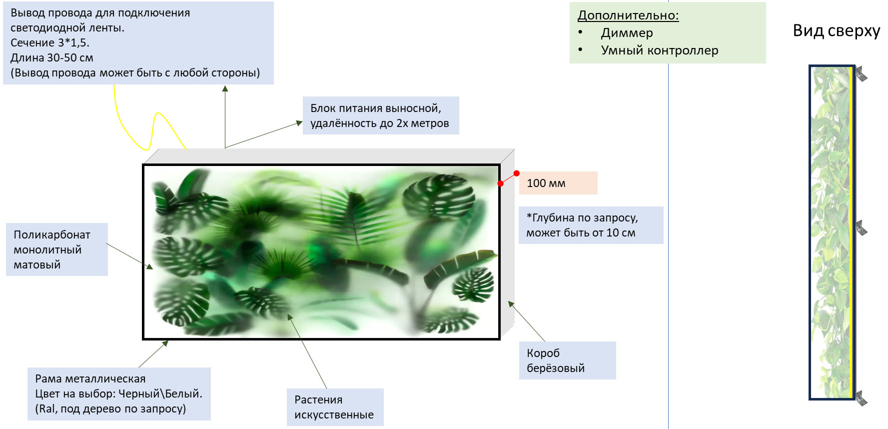 Это украшение станет не только элементом декора, но и предметом обсуждения для ваших гостей. Таким образом, лайтбокс с искусственными растениями за матовым стеклом — это не просто товар, а возможность преобразить ваше пространство, добавить яркие акценты и создать уникальную атмосферу.