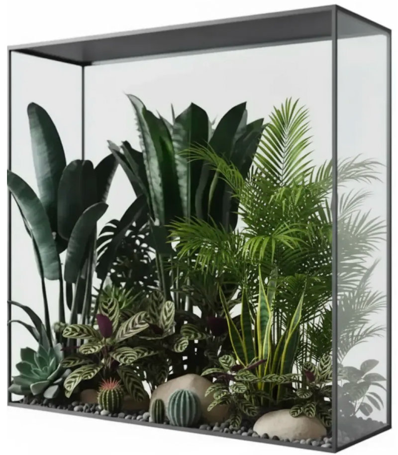 Внутреннее наполнения может включает разнообразные виды зелени, что делает каждый фитобокс уникальным. Этот вариант также легко адаптируется под разные стили интерьера – от минимализма до джунглей. Выбор подсветки позволяет подчеркивать особенности тропических или лесных растений в зависимости от заданной атмосферы.