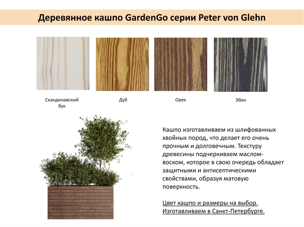 Мы предлагаем кастомизацию изделий, включая выбор размера, формы, цвета и отделки, чтобы кашпо органично вписались в ваш стиль. Мы также предлагаем дополнительные декоративные элементы, такие как резьба, роспись или подсветка. Это позволяет вашему кашпо стать не просто функциональным элементом для размещения растений, но и настоящим арт-объектом.