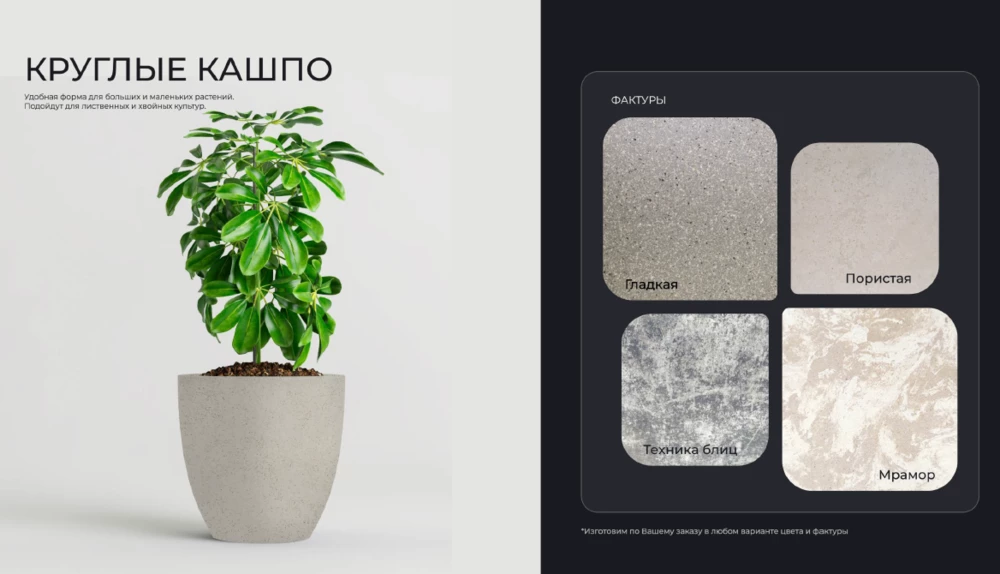 • Кашпо из искусственного камня уникальной технологии ручного производства, изготавливаются на заказ, поэтому можем собрать изделие по индивидуальным габаритам, оттенкам и другим характеристикам.