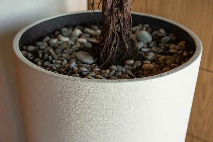 Кашпо из полимерного бетона устойчивы к образованию трещин и сколов, что делает его долговечным решением для внешнего и внутреннего озеленения. Полимерный бетон не подвержен коррозии, поэтому кашпо будут служить долгое время без необходимости частого ухода или замены.