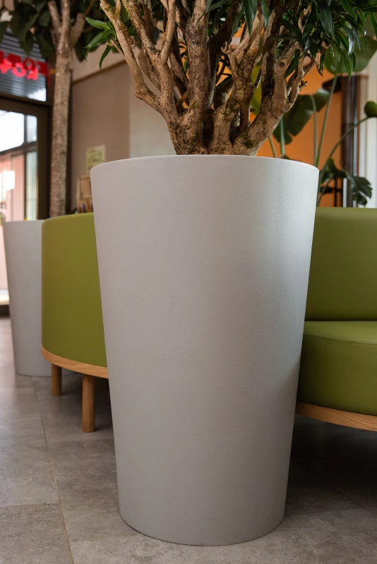 Кашпо из полимерного бетона устойчивы к образованию трещин и сколов, что делает его долговечным решением для внешнего и внутреннего озеленения. Полимерный бетон не подвержен коррозии, поэтому кашпо будут служить долгое время без необходимости частого ухода или замены.