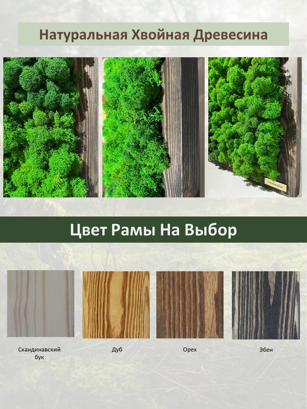 Панно из стабилизированного мха Состав: пласты+ягель альпийский+эвкалипт+галька Цвет мха: 1 оттенок Рама: дерево, хвойный массив, оттенок на выбор. Ш4см*Г3см Подсветка: нет (по запросу на выбор) Способ крепления: саморезы+петли (входят в комплект поста...