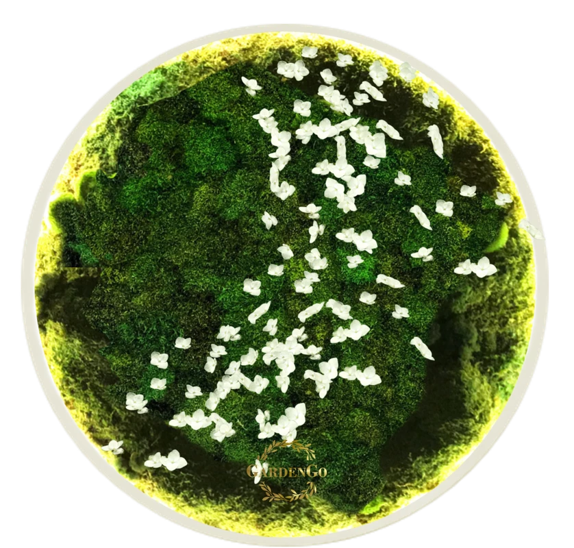 Панно из мха "Пласты с гортензией" в круглой раме с подсветкой №59