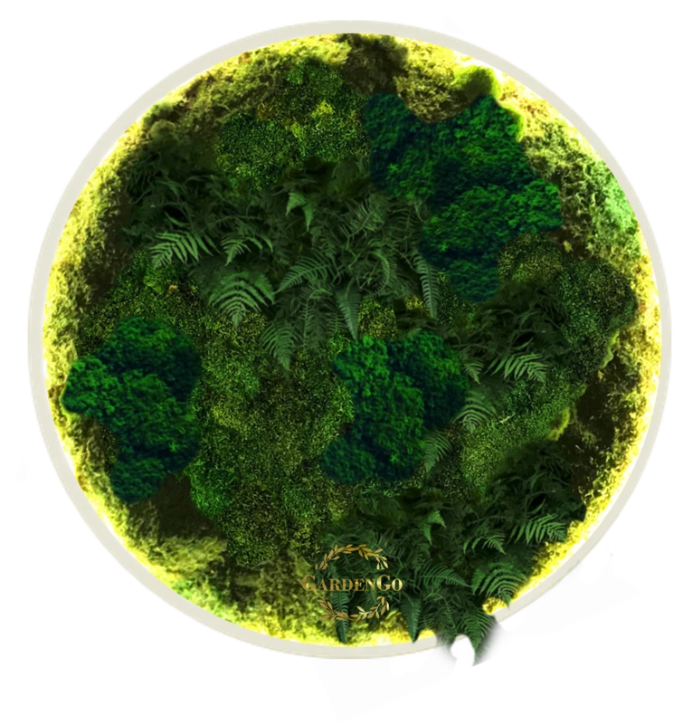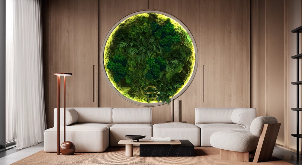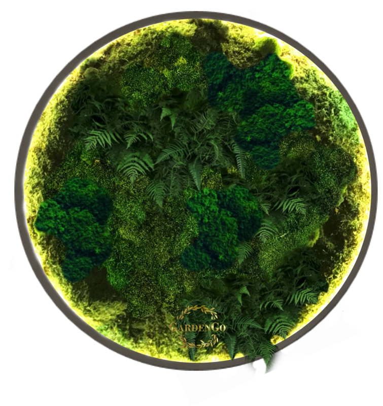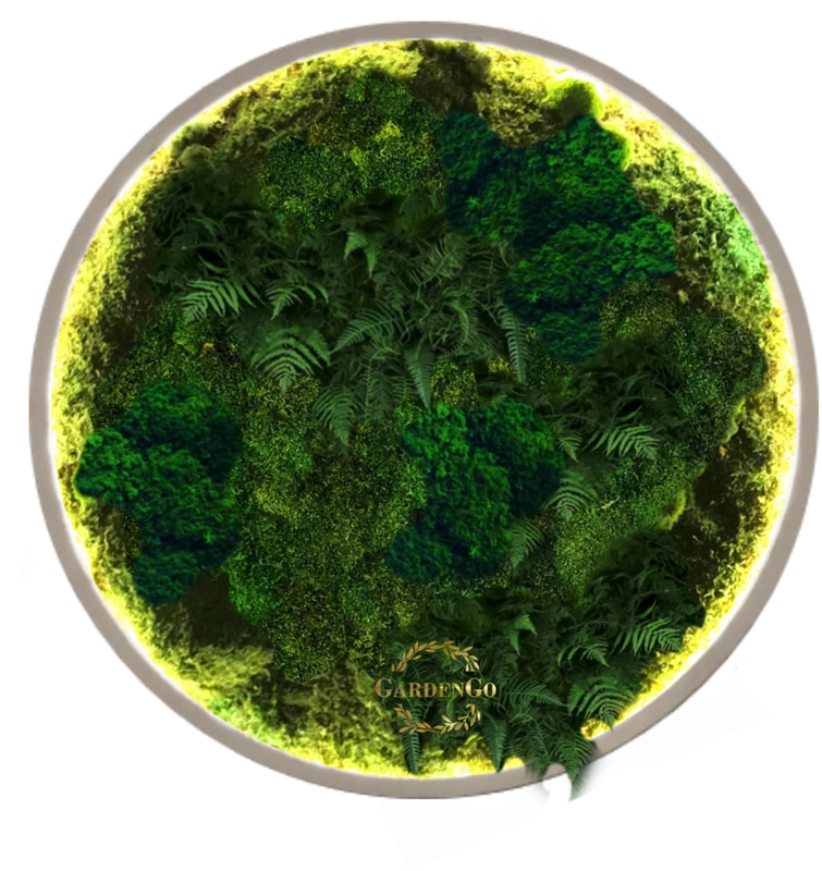 Панно из мха "Папоротник" в круглой раме с подсветкой №62