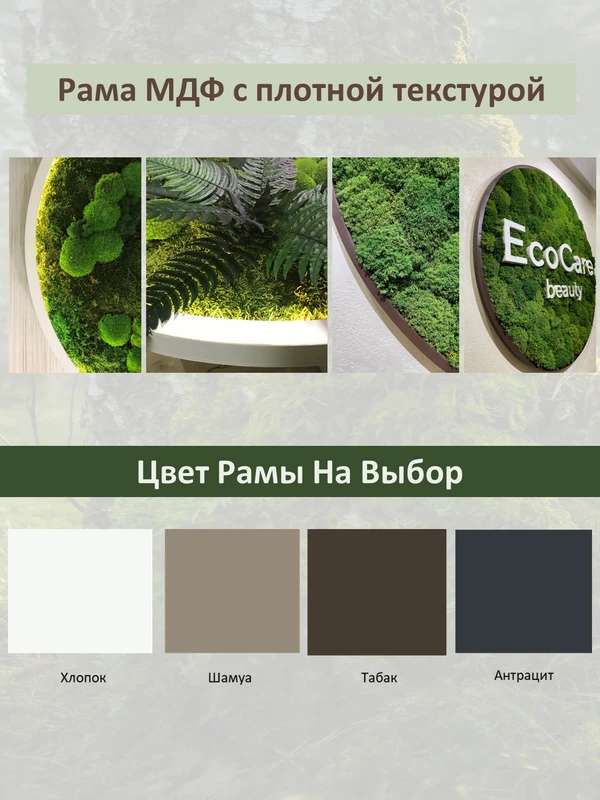 Панно из стабилизированного мха Состав: Ягель Альпийский Цвет мха: 5 оттенков Рама: дерево, хвойный массив, оттенок: на выбор Ш4 см*Г3 см Подсветка: нет (по запросу на выбор) Способ крепления: саморезы+петли (входят в комплект поставки) Если вы не на...