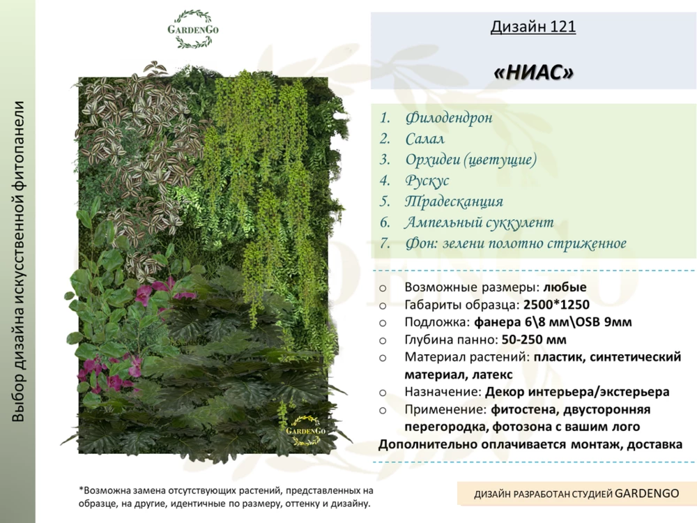 Фитостена искусственная. Дизайн №125 "АМУНТАЙ" искусственная Состав: Алоказия, Аглаонема, Эвкалипт, 2 вида Папоротника Фон: Полотно зелени стриженной Основа: Фанера 6 мм с покрытием Глубина общая: 15 см Если вы не нашли подходящий размер или хотите и...