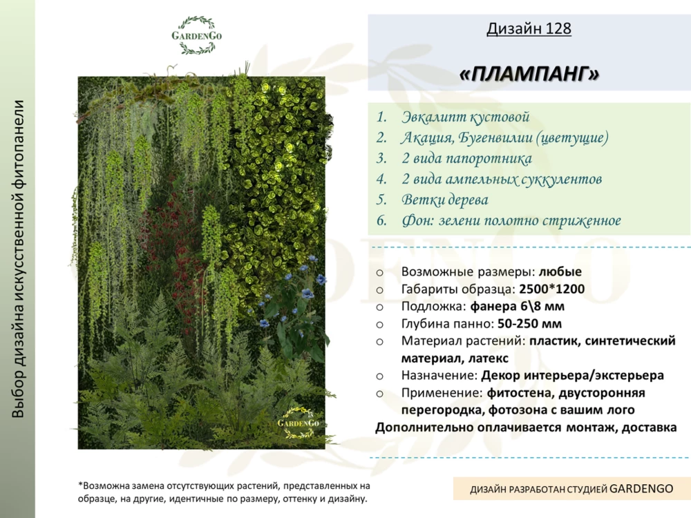 GardenGo предлагает широкий выбор фитостен, включая различные виды растений, цветовые решения и текстуры. Вы можете выбрать как яркие, насыщенные варианты, так и более спокойные, нейтральные оттенки, что позволяет легко интегрировать их в любой интерьер.