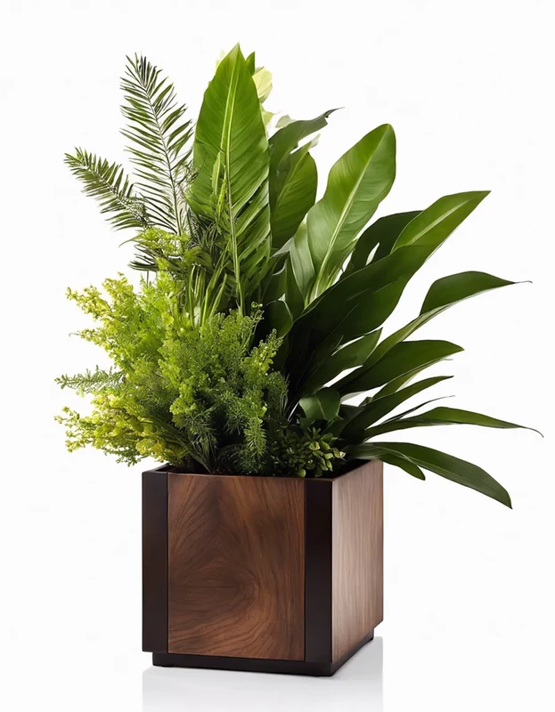 Кашпо с композицией из искусственных растений Растения искусственные: береза 240 см , кипарис 50 см , осока 35 см , самшит 30 см , калатея25 см , Спатифиллум (15 шт. на 1 м2) Кашпо: дерево с покрытием на выбор (эмаль\масло-воск) Цвет кашпо: Орех (на