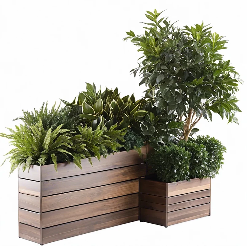 Кашпо с композицией из искусственных растений, комплект из 3 шт. Растения искусственные: Берёза 160 см , папоротник 50 см , рускус 46 см , Пилея, осока, калатея, эхеверия (15 шт. на 1 м2) Кашпо: фанера с покрытием на выбор (эмаль\масло-воск) Цвет ка