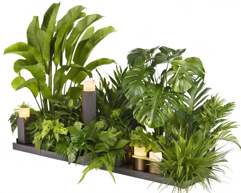 Микс искусственных растений в тропическом стиле с папоротниками в и короткой ампельной зелени -Деревянная основа из окрашенного массива дерева -Металлические цепочки\джут\угловые крепления Дополнительно: *Цвет дерева на выбор *Подсветк