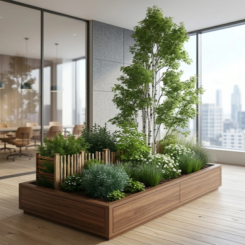 Кашпо с композицией из искусственных растений Растения искусственные: береза 200, 140 см , лисохвост 70 см , осока 35 см , самшит 60 см , Плектрантус 25 см , ромашка, лаванда (15 шт. на 1 м2) Кашпо-забор: дерево с покрытием на выбор (эмаль\масло-воск
