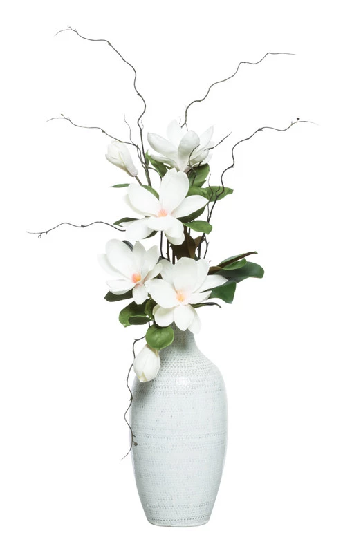 Декор настольный "Магнолия" , искусственные цветы в керамической вазе Цветы: 5 веток магнолии, 3 ветки фисташки Ваза: белая В25 или по наличию аналог Размеры общие: В 60