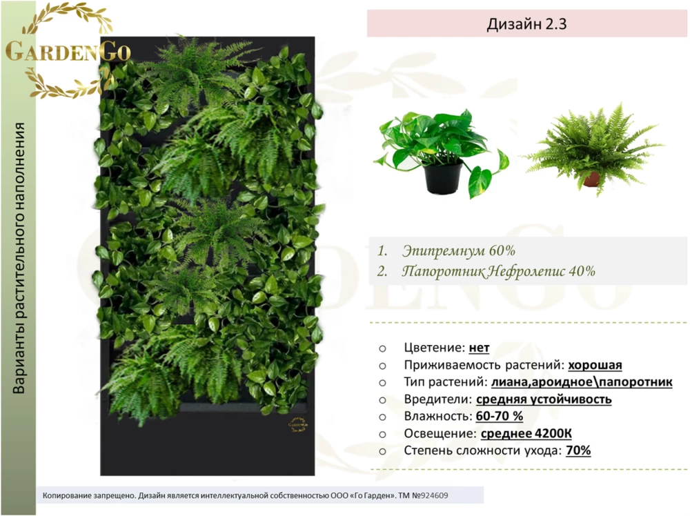 Дизайн № 2.6 Эпипремнум 70% Аглаонема Ред Даймонд 30% Если вы не нашли подходящий размер или дизайн,- обратитесь к менеджеру для подбора и составления индивидуального проекта Назначение: монолитная фитоконструкция с автополивом для содержания...
