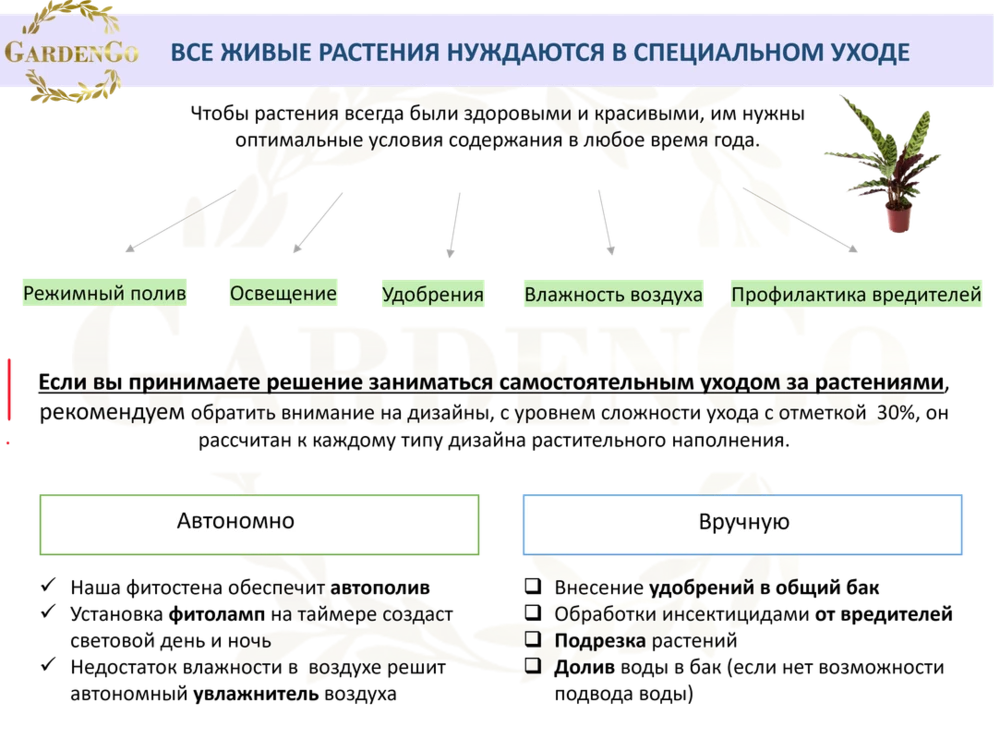 При покупке фитостены с автополивом и растениями в нашем магазине, вы получите подробное сопровождение, включающее в себя паспорт фитоконструкции, рекомендации по обслуживанию, ее настройки и содержания. Информацию по уходу за растениями и необходимым настройкам таймеров.