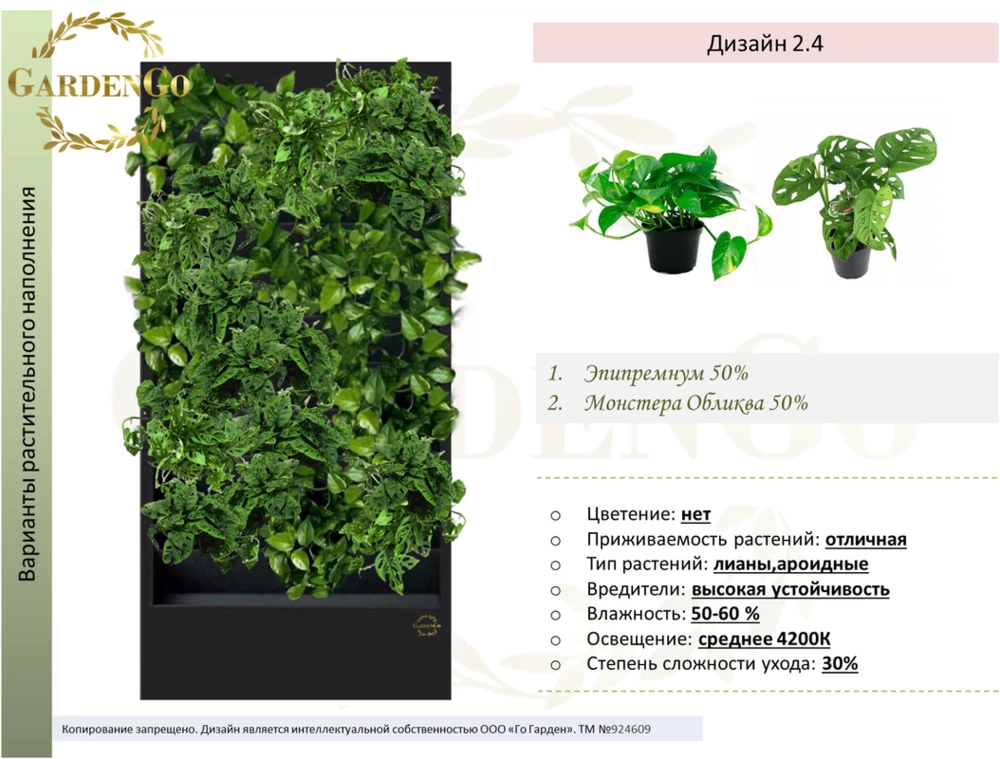 Дизайн № 2.10 Эпипремнум 60% Маранта Триколор 40% Если вы не нашли подходящий размер или дизайн,- обратитесь к менеджеру для подбора и составления индивидуального проекта Назначение: монолитная фитоконструкция с автополивом для содержания жив...