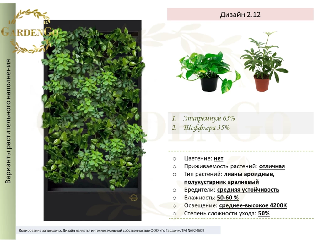 Дизайн № 3.1 Эпипремнум 45% Аглаонема Сильвер Бэй 35% Адиантум 20% Если вы не нашли подходящий размер или дизайн,- обратитесь к менеджеру для подбора и составления индивидуального проекта Назначение: монолитная фитоконструкция с автополивом д...