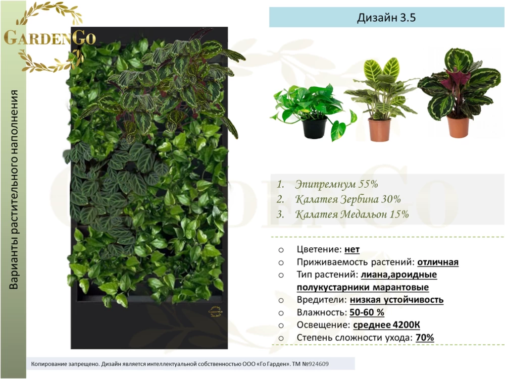 Дизайн № 3.1 Эпипремнум 45% Аглаонема Сильвер Бэй 35% Адиантум 20% Если вы не нашли подходящий размер или дизайн,- обратитесь к менеджеру для подбора и составления индивидуального проекта Назначение: монолитная фитоконструкция с автополивом д...