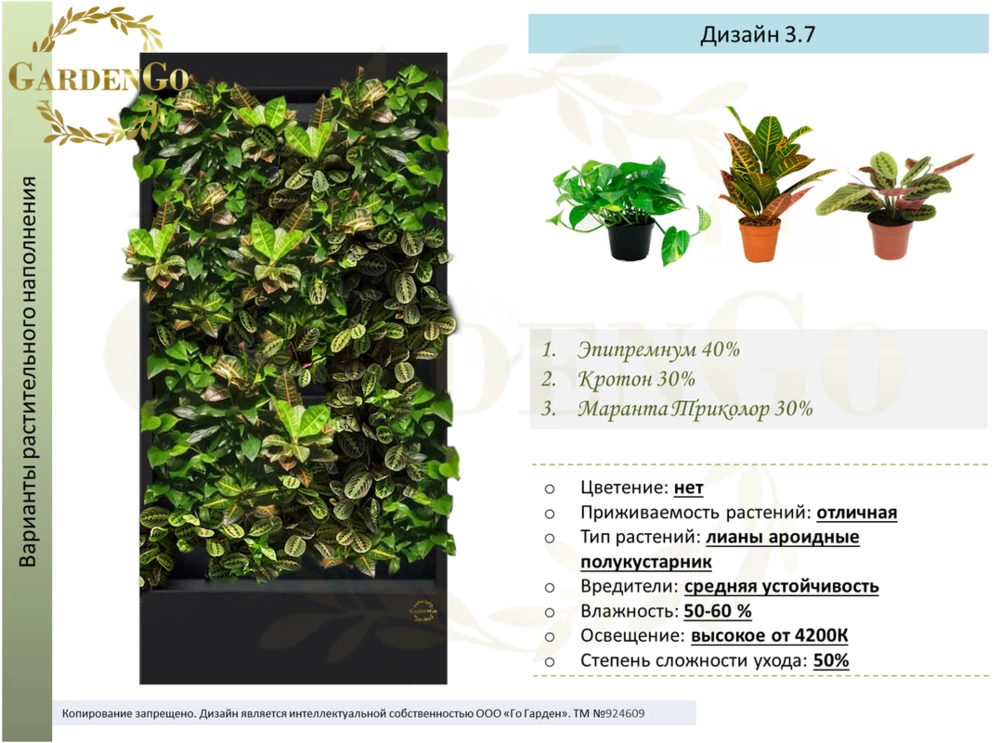 Дизайн № 2.6 Эпипремнум 70% Аглаонема Ред Даймонд 30% Если вы не нашли подходящий размер или дизайн,- обратитесь к менеджеру для подбора и составления индивидуального проекта Назначение: монолитная фитоконструкция с автополивом для содержания...