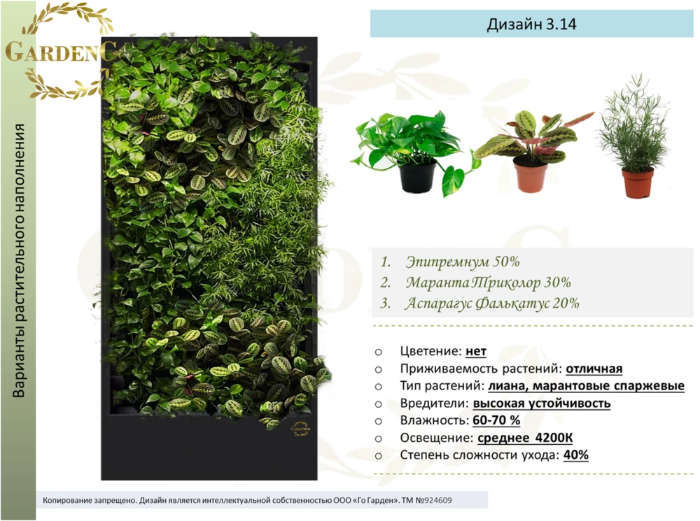 Дизайн № 3.16 Аспарагус Фалькатус 30% Маранта 35% Традесканция 35% Если вы не нашли подходящий размер или дизайн,- обратитесь к менеджеру для подбора и составления индивидуального проекта Назначение: монолитная фитоконструкция с автополивом д...