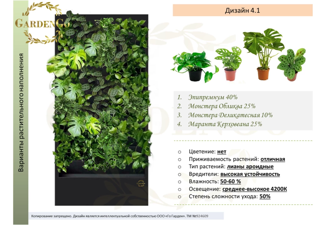 Дизайн № 3.8 Эпипремнум 60% Аглаонема Мария 20% Традесканция 20% Если вы не нашли подходящий размер или дизайн,- обратитесь к менеджеру для подбора и составления индивидуального проекта Назначение: монолитная фитоконструкция с автополивом для...