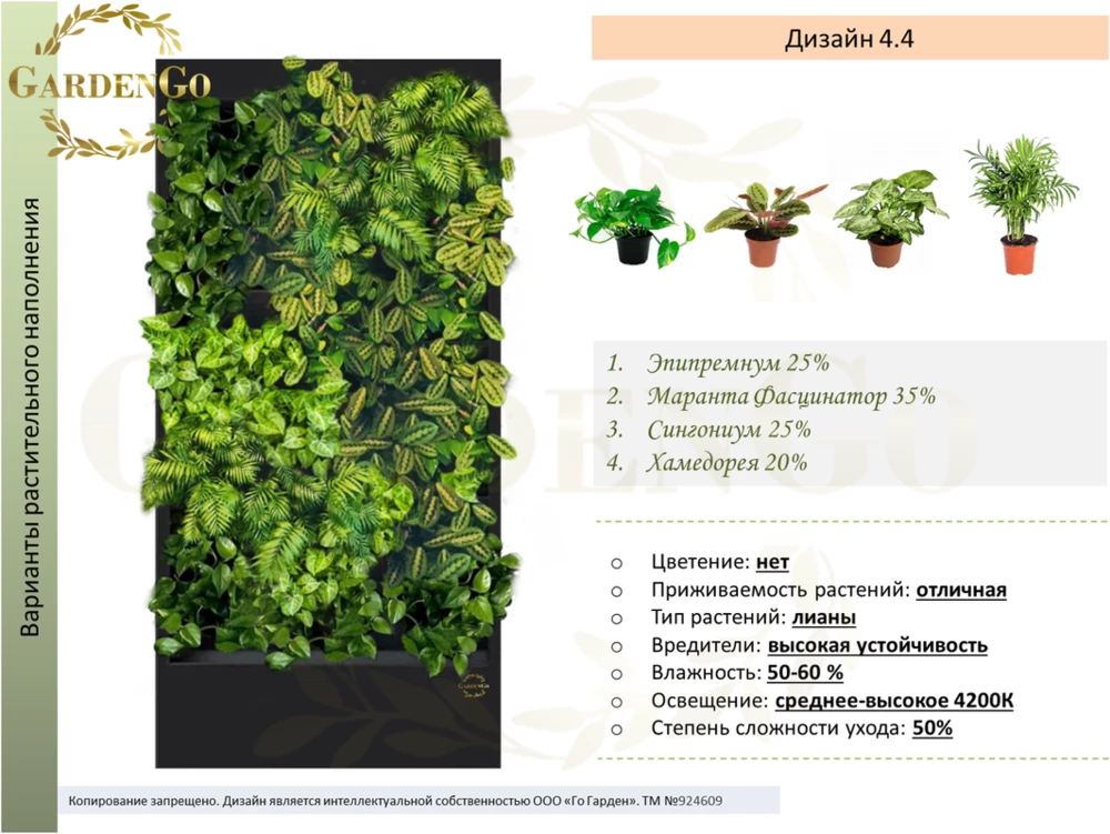 Дизайн № 3.1 Эпипремнум 45% Аглаонема Сильвер Бэй 35% Адиантум 20% Если вы не нашли подходящий размер или дизайн,- обратитесь к менеджеру для подбора и составления индивидуального проекта Назначение: монолитная фитоконструкция с автополивом д...
