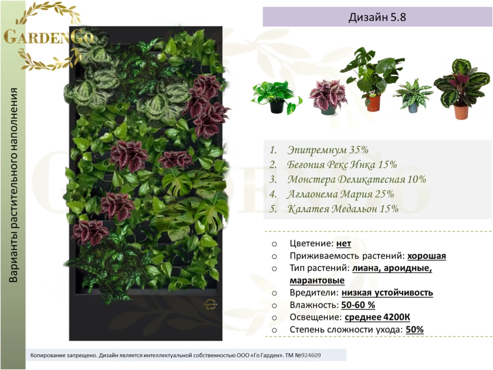 Дизайн № 3.5 Эпипремнум 55% Калатея Зербина 30% Калатея Медальон 15% Если вы не нашли подходящий размер или дизайн,- обратитесь к менеджеру для подбора и составления индивидуального проекта Назначение: монолитная фитоконструкция с автополивом...