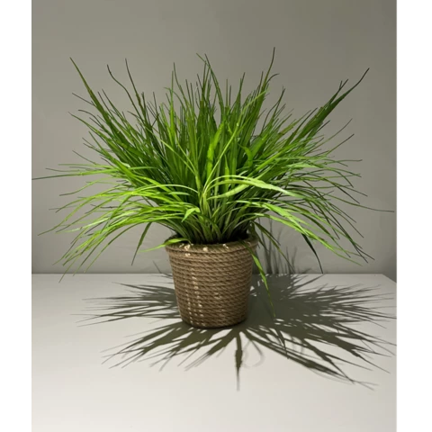 Искусственное растение "Трава Осока" в джутовом кашпо Растение: По рендеру или аналог Количество:3 куста по 70 Кашпо: Натуральный джут, пластик Д12 или по запросу Размеры общие: В 33 Ш 40