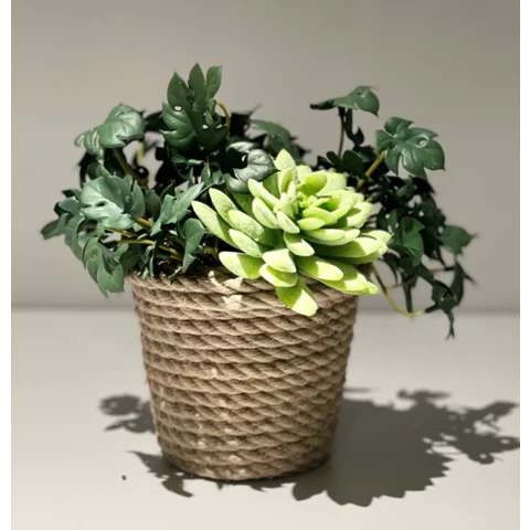 Искусственное растение "Филодендрон с суккулентом" в джутовом кашпо Растение: По рендеру или аналог Количество:1 ветка суккулента и 3 мини филодендрона Кашпо: Натуральный джут, пластик Д12 или по запросу Размеры общие: В 20 Ш 18