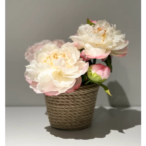Искусственное растение "Пионы" в джутовом кашпо Цветы: По рендеру или аналог Количество: 1 ветка Кашпо: Натуральный джут, пластик Д12 или по запросу Размеры общие: В 25 Ш 22