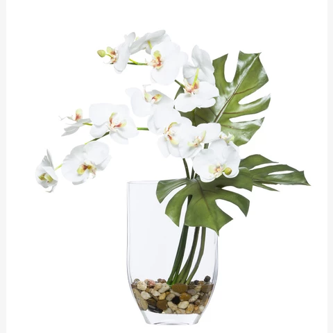Декор настольный искусственные цветы в стеклянной вазе "Композиция с орхидеей и монстерой" Цветы: орхидея 3 цветоноса, 3 монстеры мини Кашпо: стекло с камнями и имитацией воды (эпоксиднойолой) или по наличию аналог Размеры общие: В 35, Д 25
