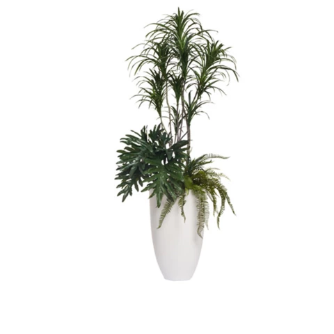 Искусственные растение в кашпо "Драцена с папоротником " Искусственные кусты драцены (2шт.) , папоротник (2 шт.), филодендрон (5 шт.) Растения: По рендеру или аналог Количество: 9 кустов Кашпо: Белое, пластиковое\файбергласс. Д 35 или по наличию анало